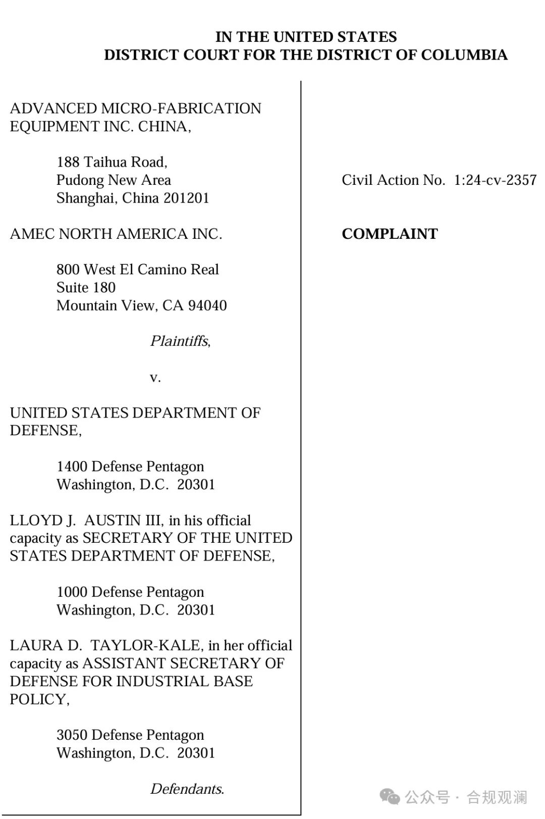 中国企业针对涉美制裁清单的维权之路尽管布满荆棘,但我们的企业依然迎难而上,坚持不懈通过法律手段维护自身合法权益。2024年中微公司诉美国国防部的成功案例即在确保移除清单的同时,对美单边制裁的荒诞行为进行了指控和列举,彰显了我高科技企业的正能量,切实维护了中国企业的合法权益。以下合规观澜将中微公司成功维权案例及“起诉书”向大家再次分享,供各位同仁借鉴和学习。