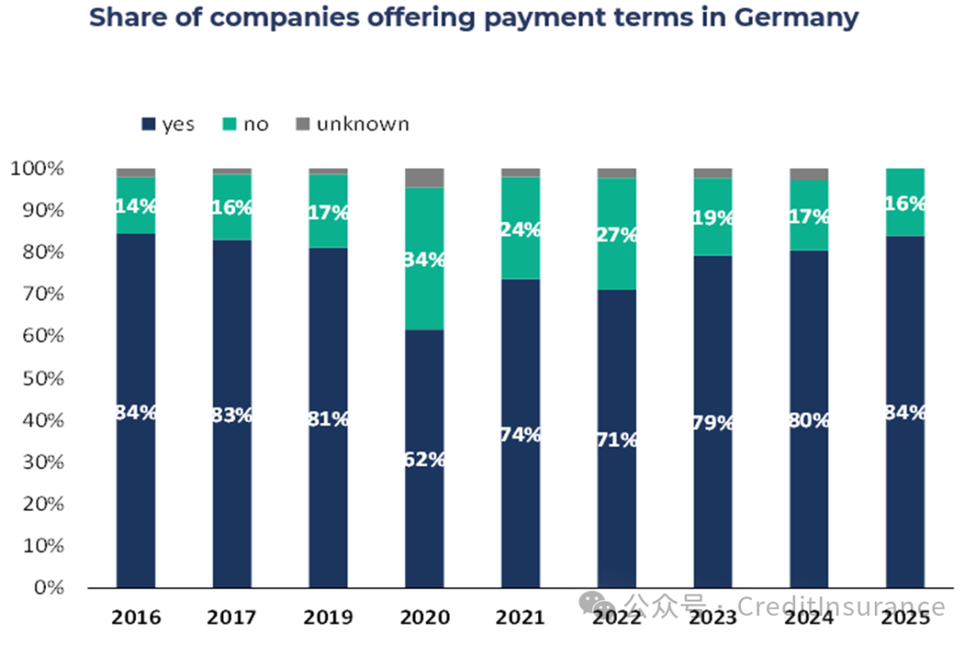 2025 年,84% 的德国企业提供付款期限,这是 2016 年以来的最高纪录。与此同时,德国传统上对短期付款期限的偏好进一步强化:92% 的受访企业要求在 60 天内付款,与 2016 年水平持平。尽管出现这些变化,平均付款期限几乎保持不变,为 32.5 天(2024 年为 32.1 天)。