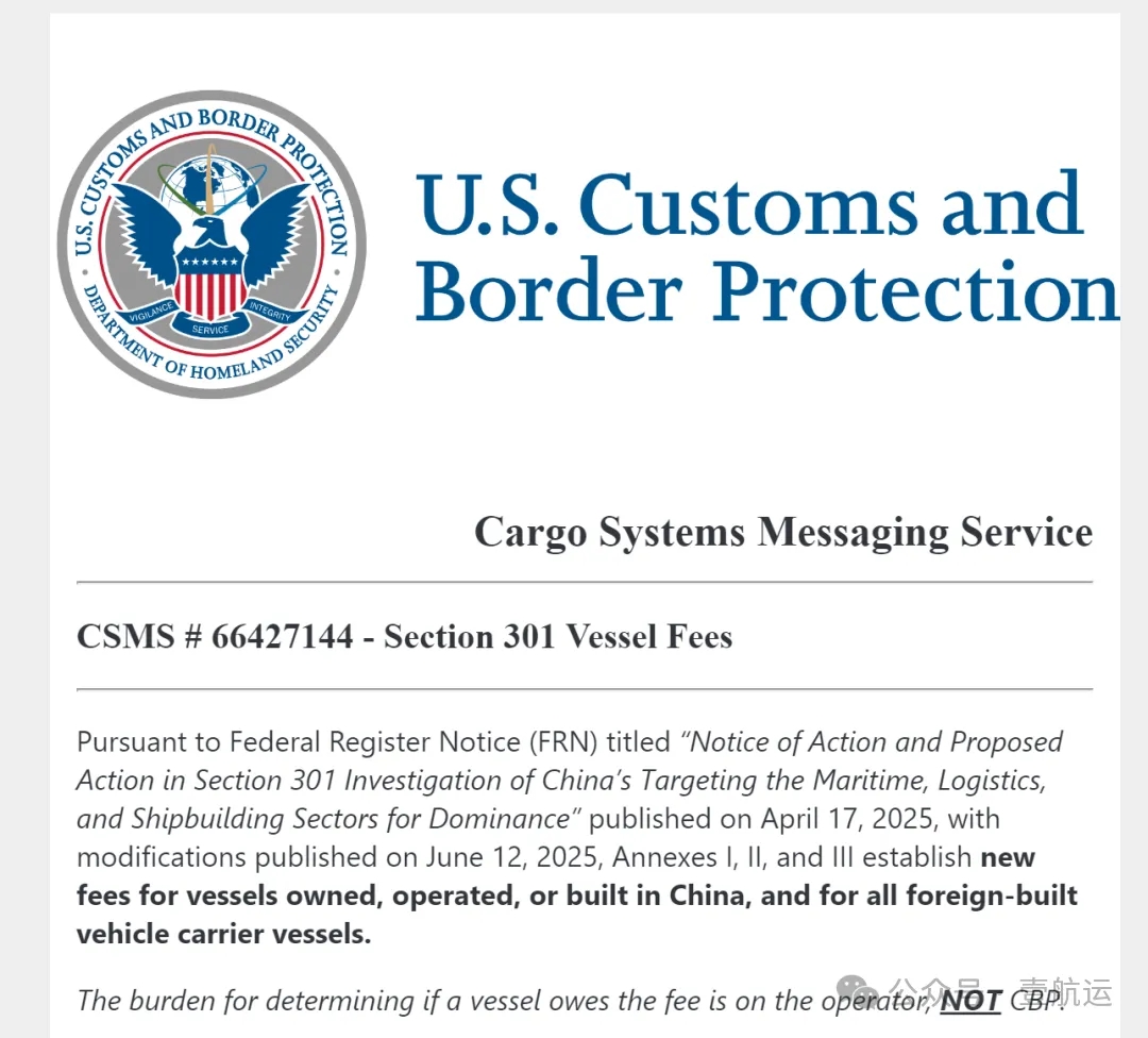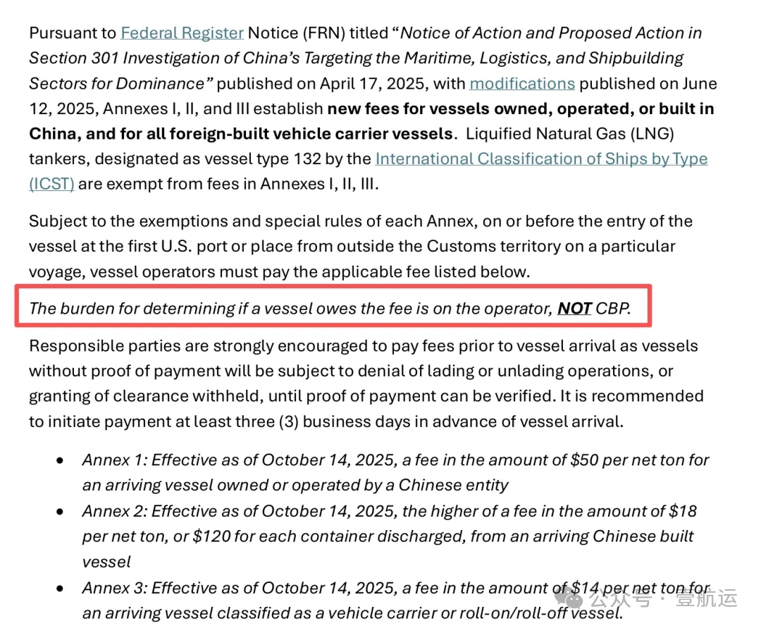 也就是说,美国政府把合规与缴费责任完全转嫁给船公司自己。换句话说:“船东和运营人要自己查明自己是否被归入‘中国拥有、运营或建造’范畴并缴纳费用,否则后果自负。”