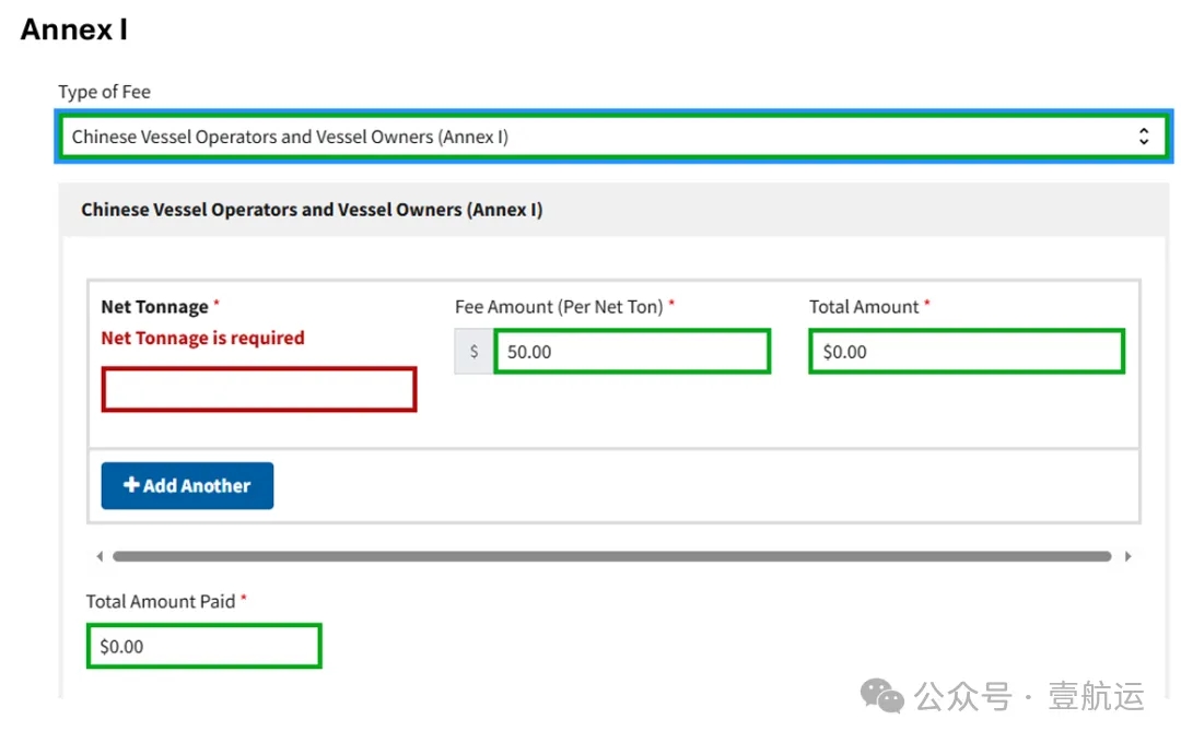 附录 I:对中国实体拥有或运营的船舶征收每净吨50美元的费用;