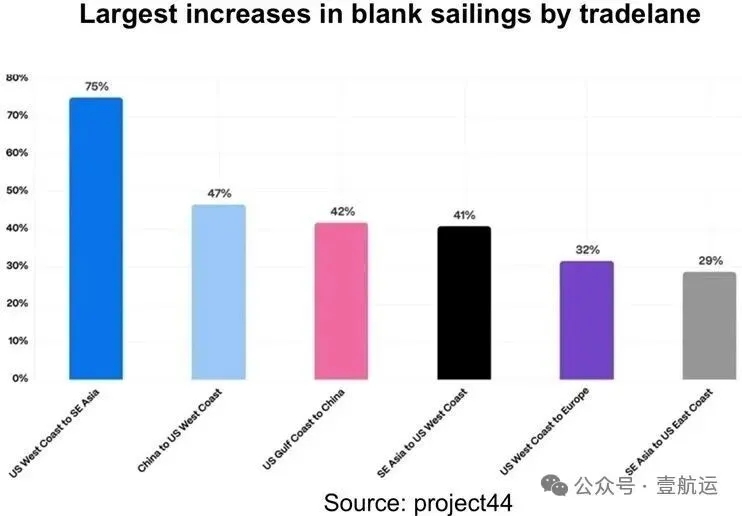 今年迄今为止,所有主要美国航线的空白航班数量都在激增,例如,美国西海岸和东南亚之间的空白航班数量增长了 75%。