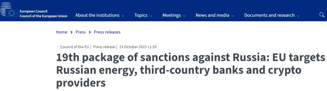 https://www.consilium.europa.eu/en/press/press-releases/2025/10/23/19th-package-of-sanctions-against-russia-eu-targets-russian-energy-third-country-banks-and-crypto-providers/
