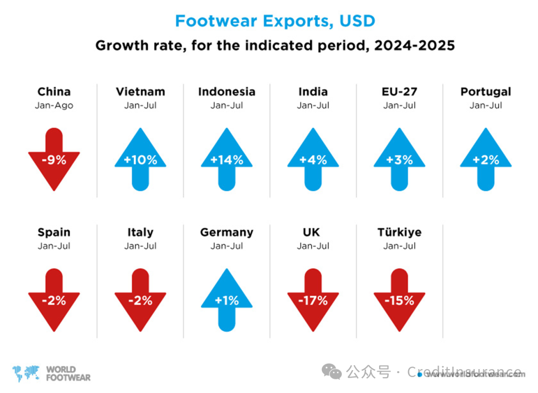 这一情况与亚洲其他主要生产国的持续增长形成鲜明对比,越南、印尼表现突出,印度也有小幅增长。2025 年 1-7 月,越南鞋类出口金额同比增长 9.5%,达 141 亿美元;印尼同比增长 13.6%,达 42 亿欧元;印度同比增长 3.7%,达 14 亿欧元。