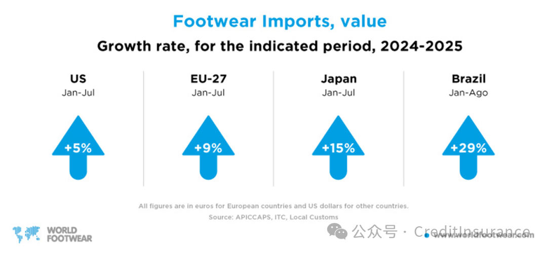 同期,欧盟进口鞋类 19 亿双,金额达 326 亿欧元,与 2024 年 1-7 月相比,进口数量同比增长 11.2%,进口金额同比增长 9.0%。