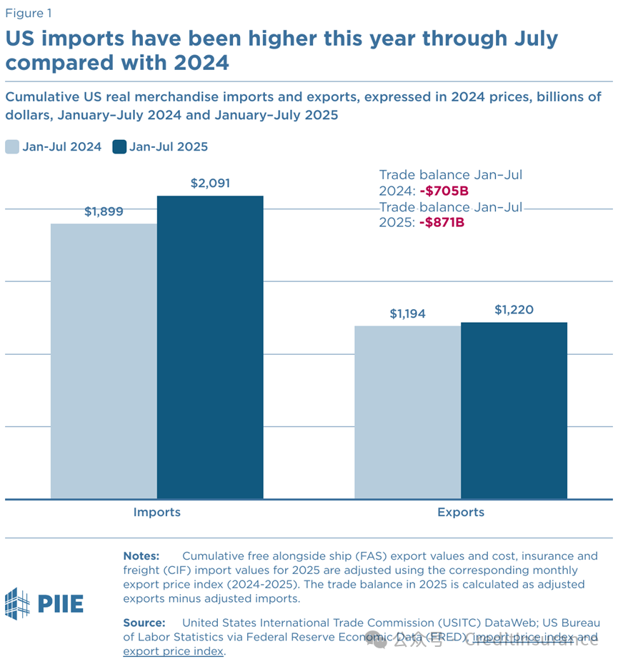 图 1 还展示了 2024 年和 2025 年 1-7 月经通胀调整后的累计商品贸易逆差。由于今年早些时候企业提前备货,且美国经济表现稳健,进口增长、出口持平的组合使得实际贸易逆差进一步扩大:2025 年同期逆差达 8710 亿美元,而 2024 年同期为 7050 亿美元。
