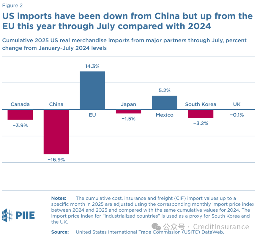 不过,进口商与消费者的 “好日子” 在 2025 年 3 月达到峰值。到 2025 年 7 月,美国从多个主要伙伴的累计商品进口额(经通胀调整后)已逐渐接近 2024 年同期水平。其中,美国从欧盟的进口仍远高于 2024 年同期,增幅达 14.3%—— 这或许是因为美国对欧盟的关税言论比实际关税政策更激进;而美国从中国的进口则远低于 2024 年同期,降幅达 16.9%,这与美国对中国实施的严格关税政策直接相关。