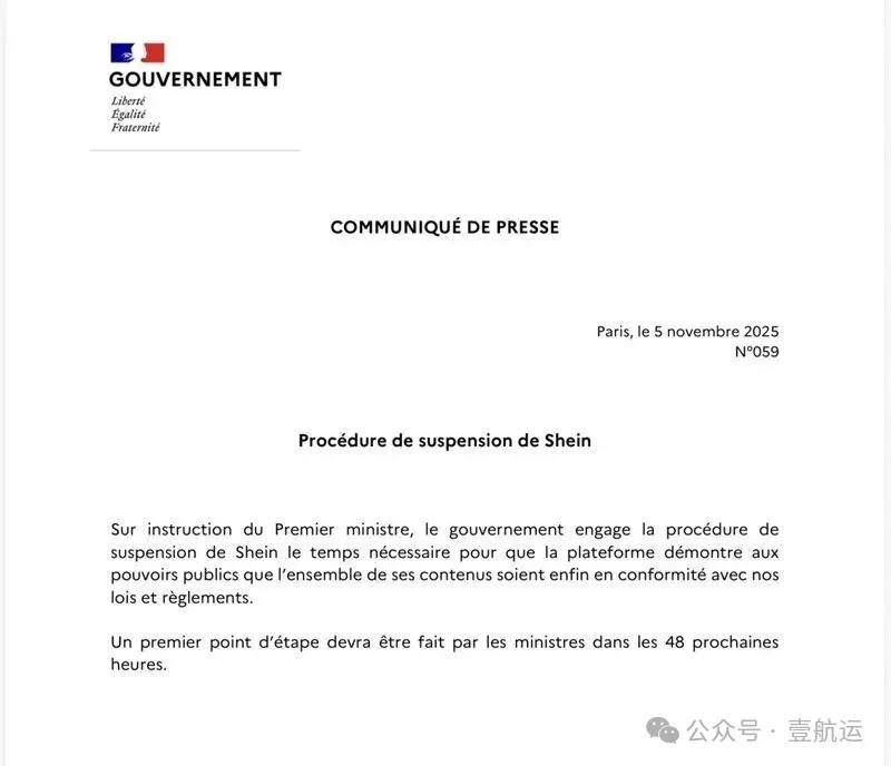 据悉当地时间11 月 5 日星期三傍晚,法国经济部宣布,内政部长洛朗·努涅斯 (Laurent Nuñez) 已 “ 将此事告上法庭,要求封锁该网站 ”, 理由 是“该平台 侵权的系统性和重复性”。 他说,这一程序旨在 “ 彻底结束 Shein 的 失败对公共秩序造成的严重损害”。