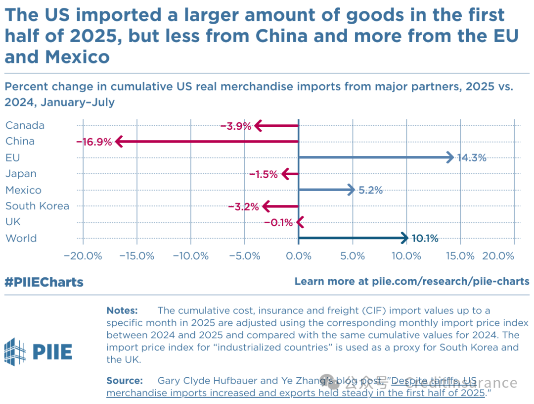 随着特朗普政府今年初发起贸易战,部分经济学家曾预测美国商品进口量将大幅下滑。数据显示,2025年1-7月美国从中国等部分国家的进口确实减少,但从欧盟、墨西哥等其他贸易伙伴的进口量同比上升。