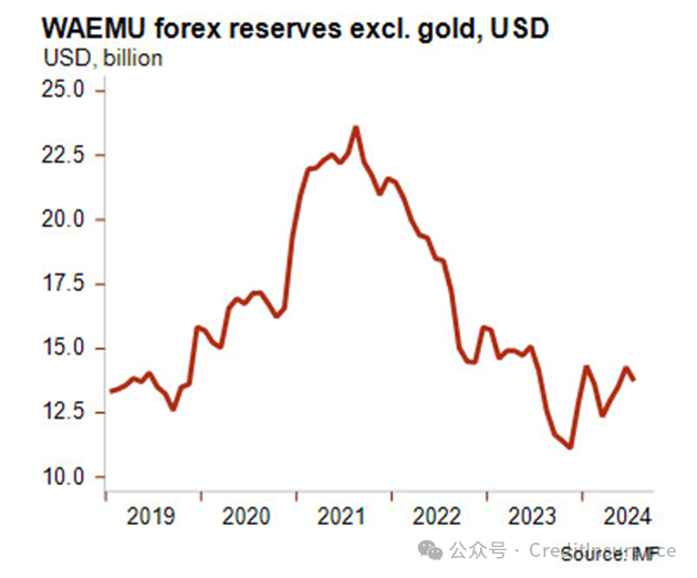 在货币区内,贝宁可以使用集中的外汇储备。然而,自 2021 年以来,由于不利的贸易条件(在燃料和粮食净进口地区)、安全风险上升以及三个前成员国(布基纳法索、马里和尼日尔)的孤立,这一优势受到了打击。由此产生的流动性压力,导致该地区的外汇储备在 2023 年降至不足 2.5 个月的进口额,这对于维护与欧元的挂钩来说是一个较低的水平。2024 年上半年,在贝宁、科特迪瓦和塞内加尔发行欧洲债券的支持下,外汇储备有所恢复,压力有所缓解。