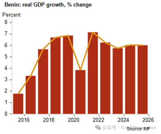 自2016年帕特里斯-塔龙(Patrice Talon)就任总统以来,除了COVID冲击期间,该国一直保持着强劲的增长势头。这得益于商业友好型政策、制度改进(尤其是在腐败和政府效率方面)、结构改革以及对国家发展的总体承诺。贝宁的经济前景依然乐观,预计在中长期贸易体制下,实际 GDP 增长率将保持在 6% 以上,成为西非表现最好的国家之一。虽然基础设施投资仍将是增长的主要动力,但国内经济预计将继续受益于农产工业的积极发展、自然资源转化为制成品(如加工大豆、纺织品等),以及通过西非次区域主要贸易枢纽科托努(Cotonou)港进行的过境贸易。此外,旅游业是一个不断扩大的服务行业,具有令人感兴趣的潜力,而棉花则是该国传统的强大外汇来源(仅次于食品出口)。尽管如此,棉花生产越来越受到气候变化的影响,最近的极端高温和洪水灾害就证明了这一点。此外,尼日尔和贝宁之间的外交纠纷和临时关闭边境,暂时影响了今年的港口活动。这阻碍了尼日尔新石油管道的石油出口,直到 2024 年 8 月边境重新开放。虽然尼日尔的军政府变得更加不可预测,但运营石油管道的双边经济利益(为贝宁带来贸易和海关收入)将是一个强有力的缓解因素。预计 2026 年总统选举前后也会出现内部不确定性,因为宪法不允许塔龙总统寻求第三个任期。我们将密切关注政治事态的发展,以确定塔龙总统在其十年执政后的遗产能否得到保障。